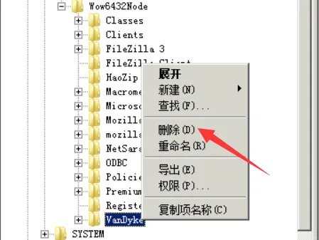 将HKEY_LOCAL_MACHINA—>SOFTWARE—>Wow6432Node—>VanDyke删除后即可
