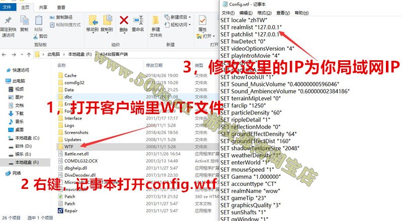 第二种:如果没有”单机.bat“ 这类的万能登陆器,打开客户端里的WTP文件,修改里面的config.wtf 文件,替换IP后保存。如下图修改: