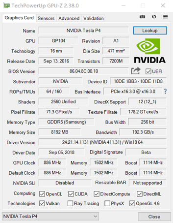 图4-1 Tesla P4的GPU-Z信息