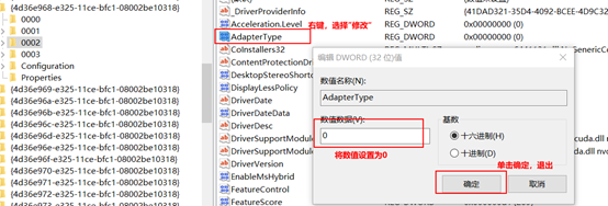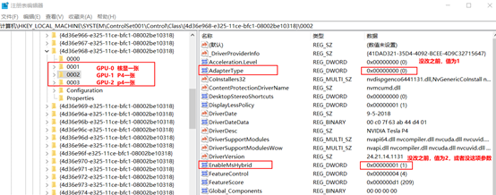 在注册表中,经过我阅读其他人的尝试(参考链接已给出,有些需梯子),以及结合自己实际情况,找到了不同显卡对应参数项,不同机器可能会略有差别,但大差不大,图中所示的001参数项应该属于我的核显,002和003分别对应我的两张P4。我们现在要做的是修改002和003的AdapterType、EnableMsHybrid参数,使得P4支持Drectx和OpenGL运算,并且通过核显进行显示输出。