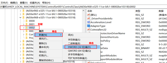 接着,我们需要对002和003的EnableMsHybrid参数设置,如果你没有找到这个参数,需要先手动创建这个参数。创建这个参数,以002为例,右键002,单击新建,单击“DWORD(32)位值(D)“,