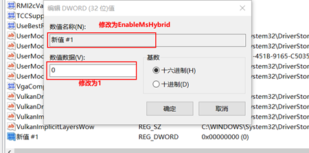 右键修改新值的名称位EnableMsHybrid,并且将其值设置为1。与002一致,003当中的AdapterType和EnableMsHybrid也如此设置即可。