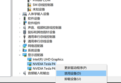 到这里,我们就快成功了。设置完成以后,我们重启电脑(建议)打开设备管理器(也还行),对P4进行禁用、再启用操作,如下图所示对P4进行禁用(我就不演示了,后台正跑着实验,不好禁用再启用:)。