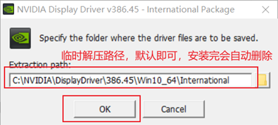 双击或者右键运行驱动程序 “386.45-tesla-desktop-win10-64bit-international.exe”,接着完成驱动解压,解压路径选择默认的即可,单机OK进行解压。