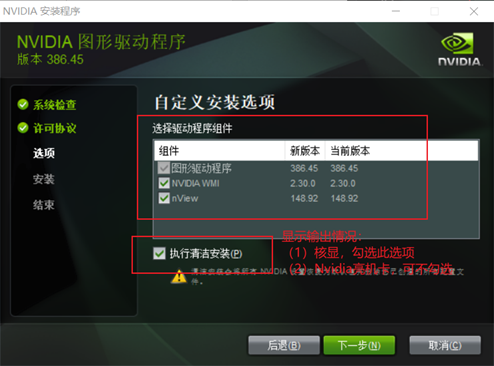 进入自定义安装选项页面,这一页面中,把全部选项勾选,并将“执行清洁安装”勾选(这一选项视情况而定,若你使用的是核显,请勾选这一步,若你另外有一张Nvidia的显卡充当显示输出,这一步可以不勾选,以免不小心地删除亮机卡驱动),单击下一步进行驱动安装即可。