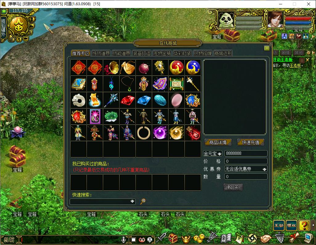 1、可购买福袋或者套装,及BB坐骑 ,仙灵卡商店添加九转仙灵露相性药,以及飞升需要的材料。商城内有特级点化丹,羽化丹,十级镶嵌令等等